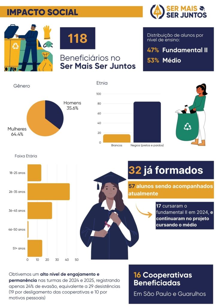 O programa atende cooperados(as) catadores(as) que enfrentam desafios socioeconômicos significativos e, muitas vezes, interromperam seus estudos devido à necessidade de trabalhar desde cedo. A iniciativa promove: